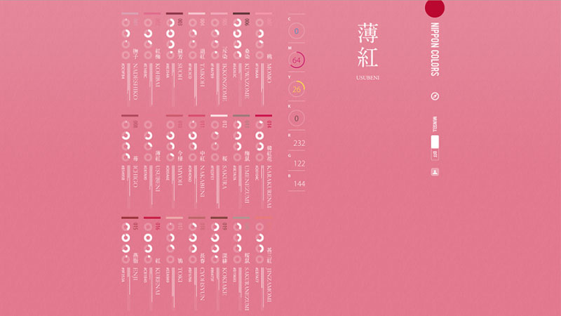 這個網站專門列舉了250種日本傳統色,且擁有了不錯的動畫過度效果。如果你對日式的色彩感興趣,這里或許能得道一些靈感。