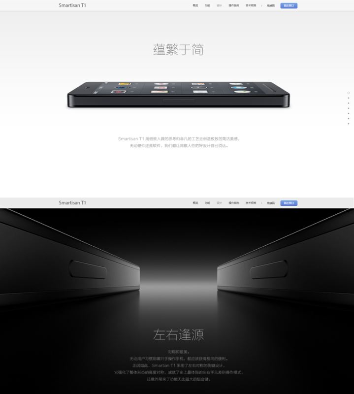 這是錘子T1的頁面設計,雖然好多人都不喜歡老羅,但是我覺得他有對設計特有的一種完美主義的偏執,無論是手機的外型(各種對稱)還是系統UI的設計,我覺得作為設計師我還應該多向他學習一下。回到頁面設計本身,我們來分析一下這個頁面的設計。