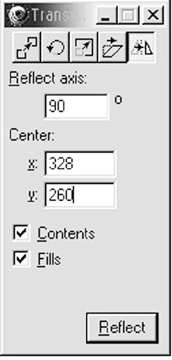 3、選中第二個橢圓,點擊“edit/clone”命令,再復制一個橢圓即第三個橢圓,選中第三個橢圓,單擊transform面板上的[reflect]圖標,其面板設置如圖4所示。(注意:其中的center中的x、y值依據第一個橢圓和第二個橢圓的相交處的位置而定)。