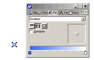 好了,我們已經得到文字的路徑了,接下來我們來創建珍珠。選擇工具面板中的ellipse橢圓形工具,按住shift鍵畫一個小圓,打開fill填充面板,從下拉列表中選擇填充類型為gradient,然后選擇輻射漸變填充(面板中的第二個按鈕選項)。設置漸變條左邊的顏色塊為藍色。如左下圖所示大小的圓形漸變填充對象。