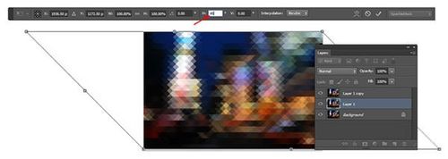 使用自由變換工具(Ctrl + T 或選擇主菜單“編輯”>“自由變換”)讓圖像水平傾斜45度。