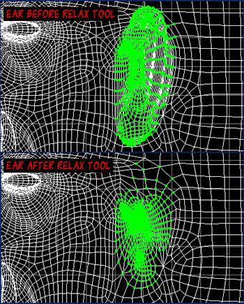 也可以調(diào)節(jié) uv 坐標(biāo)重疊的區(qū)域。可以用手動調(diào)整,也可以用 maya 的 relax 工具( edit polygons -> texture -> relax uvs )。上面是調(diào)整前,下面是調(diào)整后(耳朵)。