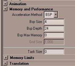 — bsp 大小, bsp 深度和 bsp 的最大存儲(chǔ)空間。不用操心 bsp 的最大存儲(chǔ)空間, bsp 的大小是指在 mental ray 要處理的場(chǎng)景中的三角形的數(shù)目,而 bsp 的深度是指 mental ray 要達(dá)到這個(gè)深度時(shí)所需的最大細(xì)分次數(shù)。 size (大?。┑淖罴阎凳?4 , 5 或者 6 ,而 depth (深度)則可以用以下三個(gè)值中的一個(gè):如果場(chǎng)景中包含的幾何體較為簡(jiǎn)單則用 25 ,中等復(fù)雜則用 40 ,如果場(chǎng)景中的幾何體很復(fù)雜則用 55 。如果深度的值超過 60 ,就會(huì)大幅增加渲染時(shí)間。