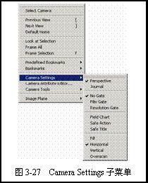 ● film gate :根據 film back 的尺寸大小,顯示可見的圖像平面框,窗口的縱橫 比決定了實際上的可視面積。圖 3-28 顯示了攝像機最大的可見區域。