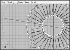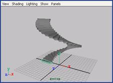 (4) 單擊 duplicate 按鈕,得到一個螺旋形的樓梯。在這里采用的是 instance 復制,這意味著對最初建立的立方體的任何操作也會被用到復制品上。切換到頂視圖,用鼠標右鍵在最初的立方體上選擇 vertex ,在這個立方體的上表面上選取它的 4 個頂點,然后旋轉平移它們與復制的立方體的底面重合在一起,如圖 3-33 所示。這樣樓體的建模工作便完成了,最后的效果應如圖 3-34 所示。