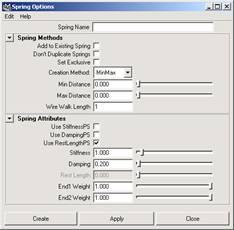 場(chǎng)景窗口中選擇柔體物體,再選擇 soft/rigid bodies → crease springs 命令,便可以打開 spring options 對(duì)話框,如圖 11-34 所示。在這個(gè)對(duì)話框中可以對(duì)彈簧作一些調(diào)整。