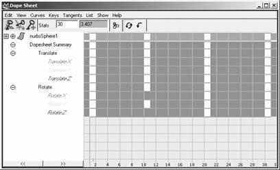 dope sheet 與 graph editor 有許多相同功能。要打開 dope sheet 窗口,選擇 window → animation editors → dope sheet 命令,打開如圖 12-18 所示的窗口。因?yàn)?dope sheet 窗口只編輯關(guān)鍵幀時(shí)間,所以它能很容易地在關(guān)鍵幀、曲線和整組曲線處移動(dòng)。