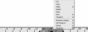 時(shí)間滑塊有幾個(gè)關(guān)鍵幀編輯功能,右擊時(shí)間滑塊可以獲得這些功能。當(dāng)單擊一個(gè)有關(guān)鍵幀的物體時(shí),時(shí)間滑塊顯示出關(guān)鍵幀的記號(hào) —— 紅色垂直線來表示關(guān)鍵幀在時(shí)間滑塊上的位置,如圖 12-20 所示。