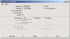 cut keys 和 copy keys 有相同的選項(xiàng)設(shè)置, edit → keys → copy □命令可以打開 copy keys options 對(duì)話框,如圖 12-19 所示。選擇 hierarchy 選項(xiàng)組中的 selected 單選按鈕,僅是復(fù)制被選物體的動(dòng)畫曲線,選擇 below 單選按鈕則復(fù)制物體的所有曲線和被選物體的下級(jí)全部物體。選擇 time range 選項(xiàng)組中 start/end 單選按鈕,并在文本框中輸入值就可以控制復(fù)制的曲線時(shí)間范圍。
