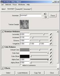 (7) 同樣用 brownian 的 color gain 和 color offset 值來調整紋理顏色。在 blinn 材質中通過移動 effentricity , specular roll off 和 specular color 滑塊來調整 specular shading(specular shading 需處理好從物體反射的光線效果 ) 效果。
