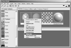 (4) 再次將同一個 brownian 紋理放至 blinn 材質的上面來看看彈出的菜單。按圖 9-12 所示選擇 bump map 命令,會發現在 blinn 材質上的 brownian 紋理的凹凸效果,同時建立了一個凹凸節點。