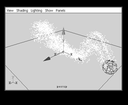 (6) 播放動畫可以看到球體的彈跳動作。下面為球體加入粒子發射器。確定 nurbs 球體處于選中的狀態,執行 particles → emit from object 命令,在彈出的對話框中為這個粒子物體命名為 ball ,單擊 add 按鈕添加粒子發射器。確認粒子處于選中的狀態,在通道欄中設置 rate 的值為 30 ,播放動畫觀看粒子的發射效果,如圖 10-30 所示。