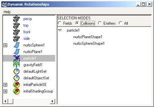 以上面的粒子碰撞場景為例,如果想斷開粒子與地面物體的碰撞效果,就執行 window → relationship editor → dynamic relationships 命令,以打開 dynamic relationships 窗口, 如圖 10-34 所示。