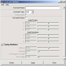 (5) 為剛體加入約束。選中第 1 個圓環(huán),執(zhí)行 soft/rigid bodies → create constraint 命令打開 constraint options 窗口,設置 constraint type 的類型為 nail ,如圖 11-21 所示。