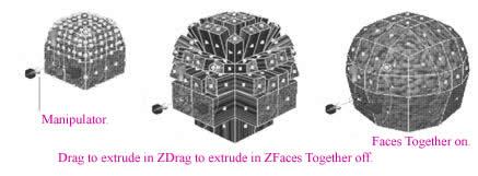 在 polygons 菜單上有 duplicate face 和 extrude 命令用于對面的操作。使用這兩個命令,既可以使處理的面連接在一起,也可以通過 polygons → tool options → keep faces together 命令使處理的面分離,如圖 5-28 所示。