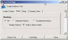 (3) 選取 sculpt surfaces 、 sculpt polygons 、 script paint 、 attribute paint 、 paint vertex color 、 paint weights 或者 paint skin weights 工具中的任意一種,并打開其 tool settings 對話框,單擊 mask 標簽,如圖 6-8 所示。