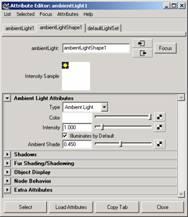 在 attribute editor 對話框中使用 ambient shade 可以將環境光的兩種相反的屬性 ( 全向屬性和方向屬性 ) 有機地結合起來。當 ambient shade 設置為 1 時,環境光看起來完全像一個點光源,從一個特定的位置照射表面。當允許光線追蹤時,環境光也能像點光源一樣投射陰影。下面制作一個場景。