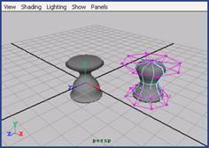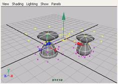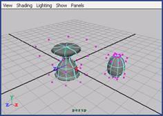 (4) 融合變形也可以作用于 blend shape 點(diǎn)。選擇第 1 個(gè)球體 ( 目標(biāo) ) 的前兩排 cvs 并選擇第 2 個(gè)球體 ( 基體 ) 的前兩排 cvs ,然后應(yīng)用 blend shape 。可得到如圖 14-22 所示的圖形。