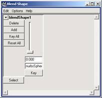 (3) 選擇 window → animation editors → blend shape 命令,則打開(kāi)了一個(gè)有目標(biāo)滑塊的編輯器,如圖 14-20 所示,同時(shí)創(chuàng)建了一個(gè) blendshape 節(jié)點(diǎn),且目標(biāo)滑塊就是該節(jié)點(diǎn)的屬性。將垂直滑塊滑至 1 ,則第 2 個(gè)球體就會(huì)形成如同第 1 個(gè)球體的復(fù)制品一樣的造型,如圖 14-21 所示。