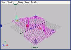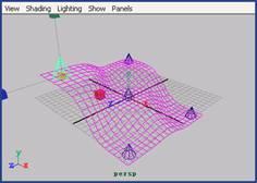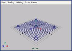 (1) 創建一個 nurbs 平面,設置 wdith=20 、 u patches=20 、 v patches=20 ,其他參數以默認值為標準,以系統默認值為基礎,創建 5 個圓錐體,布置 nurbs 平面和 5 個圓錐體之間的位置關系,如圖 14-30 所示。