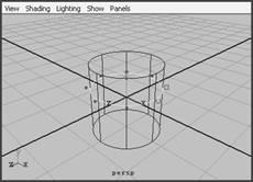 另一種生成曲線的方法是 duplicate surface curves ,實際上,這種方法并不是屬于 create 菜單,而是在 edit curve 菜單上。這是一種非常有效的曲線生成方法,特別是它能夠復制一個面上所有的等參線。試著使用該工具,生成一個默認的圓柱,顯示等參線,在表面上任意選擇一個等參線,選擇 edit curves → duplicate surface curves 命令。這樣,一條和圓柱有同樣數目段的曲線已經復制成了,如圖 4-35 所示。