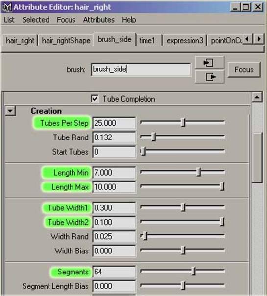 打開 hair_side_brush 設置面板,將 tubes per step 設為 25 左右(控制頭發的數量,不用很精確)。 length min=7 , length max=10 。 tube width1=0.3 , tube width2=0.1 (控制頭發的粗細,如果你將頭發設細,還要適當的增加 tubes per step 的值,來保持頭發的豐滿)。 segment=64 (控制頭發的圓滑度,這個值會影響渲染時間)。