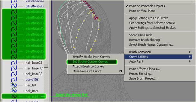 現在在 outliner 中再次選擇 hair_side_stroke01 ,并通過 shift 同時選中所有位于頭部一側的 hair_control_curve (左側或右側),執行 paint effects->curve utilities->set stroke control curves ,打開 hair_side_brush 屬性面板, tubes/behavior/forces 中,將 curvefollow 設為 1 ,這樣可使頭發沿 hair_control_curve 生長。進入 hair_side_stroke01 ,將顯示質量設為 10 左右(加速顯示更新速度)。