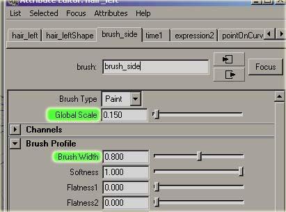 在 outliner 中雙擊 stroke 打開屬性面板,在筆刷頁中,首先調整 global scale 值,這個值的大小取決于你的頭部模型的大小,我的角色總共 8cm 高,在這里將值設為 0.150 。如果你的角色高度為 160cm 的話,值應為 3 。打開 brush profiles 找到 brush width ,這個值控制從曲線長出的頭發的寬度,將值設為 0.8 (不要將它設的太低,這樣會使你的頭發看上去非常薄)。其他的屬性保持為默認。
