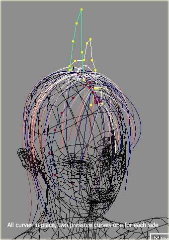 因為我們會理發,所以頭發的分布并不均勻(比如前面薄后面厚)。所以我們需要一個 pressure curve 告訴 paintfx 我們需要在哪里增加頭發。選擇 hair_side_stroke01 , painteffects->curveutilities->makepressurecurves/ 選項盒, control points=10 , offset scale=0.05 。如果 pressure curve 離的太遠或太近,你需要設置一個不同的 offset scale 。要刪除它,打開 stroke 的 pressure mapping 面板,右鍵點擊 pressuremin3 ,刪除表達式,然后刪除 pressure curve 本身。