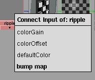 在 ripple1 的屬性編輯器中,改變 ripple origin = 0.2 and 0.3, 最后用鼠標(biāo)中鍵拖動 ripple1 到 ripple 上,在彈出的菜單中連接到 color offset 上,注意在 hypershade 中水的紋理發(fā)生的變化。 在這你會發(fā)現(xiàn)原來的紋理變白了,這是因為 color offset 是用來增加顏色的。把一個紋理賦給他,實際上也給他加了更多的顏色,結(jié)果產(chǎn)生的白色的效果。 這時的 bump 還在,盡管你看不到他。