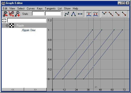 在 hypershade 窗口中,選擇 ripple3 texture ,選擇 window>animation ed99vors>graph ed99vor, 按下 w 鍵,選擇移動工具。在曲線上面敲下選擇他,按住左鍵不放配合 shift 鍵,向右移動曲線使最后的一個關(guān)鍵幀在 70 附近。