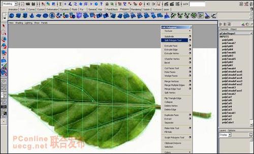 6. 選擇 edit polygons > split polyon tool 畫出葉子的結(jié) 構(gòu),注意結(jié)構(gòu)要準(zhǔn)確到位方便以后貼圖。