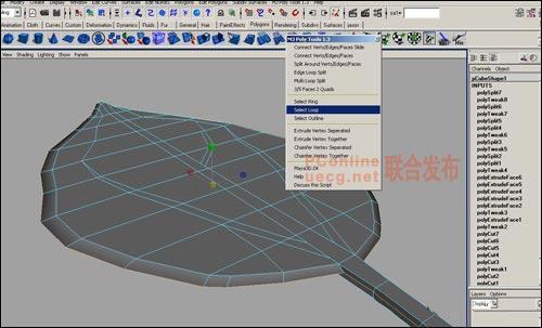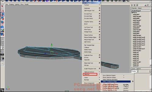 7. 把光標(biāo)對著葉子模型右鍵選擇 edge 點(diǎn)擊葉子邊緣一條邊 然后 edit polygons > selection > select contiguous edges