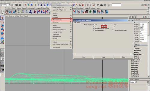 10. 葉子的正面和底面結(jié)構(gòu)大概一樣, polygons > mirror geomtry 右邊方形圖標(biāo),勾選 -y 。鏡像另外一半。