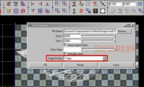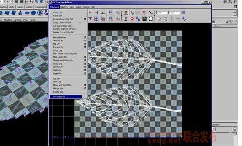 18. 在 uv 編輯器中選擇葉子的 uv , polygons > uv snapshot 把展開的 uv 線圖片保存到電腦去。