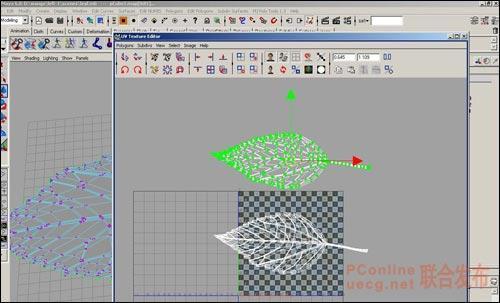 16. window > uv texture editor 打開 uv 編輯窗口,右鍵對著葉子選擇 uv, 按 w 鍵拉出葉子一邊的 uv 線。