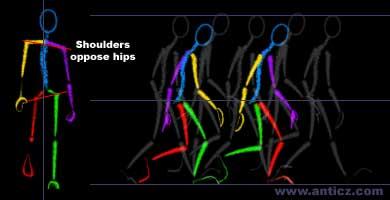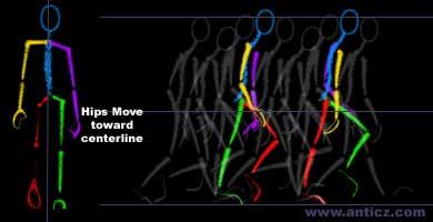 現在我們實現簡單的走路。前膝落下和彎曲,頭部向前傾移。肩和臀前翹。象下圖:
