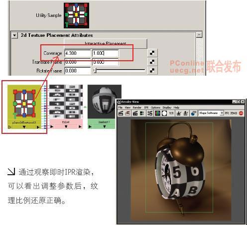 在 hypershader 窗口中,選擇模型的 place2dtexture 節點,打開屬性編輯器,調整 coverage 的數值,同時察看渲染視窗的更新效果,使用 ipr 渲染可快速看到調整結果,直到棋盤格看起來變為正方形為止。