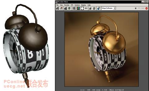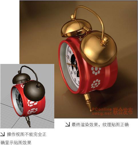 雖然紋理分布均勻,但還是有拉伸,這是應為我們使用的是 1 : 1 的紋理貼圖,而鬧鐘殼的 nurbs 面片長寬比不是 1 : 1 。下面進一步調整 nurbs 模型的紋理,是其比例正確。