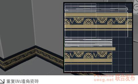 如果遇到紋理圖案需要重復的物體,則可以利用 uvs 重疊來節約一些紋理空間,例如瓷磚、天花板、花紋布、墻角線等等。從下圖中我們可以看出墻角瓷磚 uvs 重疊了多次以獲得圖案的二方連續效果。在使用 uvs 重疊時要注意不應重疊太多,否則看起來不真實,因為現實生活中沒有如此雷同的得物體。