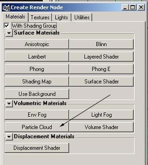 打開 window/rendering editors/multilister. 選擇 edit->create, 在 volumetric materials 中選擇 particle cloud. 如下圖所示