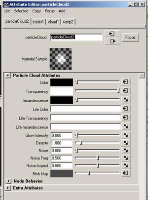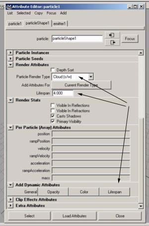 在 outlinear 中選擇 particles ,打開屬性,在 render attributes type 中選擇 could(s/w), 在 add dymamic attributes 點擊 lifespan ,上面的設置 render attributes 中,設置 lifespan 為 4 。如下圖所示 :