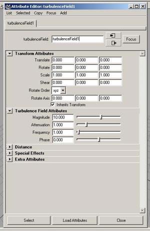 選擇 particles 物體,選擇菜單 fields/ turbulence, 打開屬性編輯器,設置 magnitude 為 10