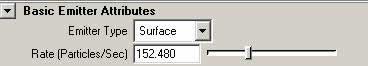 好了,現在利用 window/outliner 打開,選擇 emitter1 的屬性 ( 快捷方式是選擇物體,按 crtl+a) ,把其 rate(particles/sec) 設置為 100 左右 , 如下圖所示