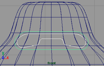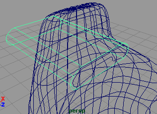 選擇后方被你剪切過的曲面,使用 edit nurbs > untrim surfaces 命令,得到 (pic 32), 將得到的曲面再次 trim 它,這次,我們要保留的區域改變了 (pic 33)