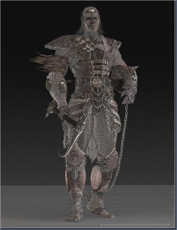 zbrush 可以制作非常詳細的 bump 貼圖細節。對于他的護膝,盾牌和盔甲,我將他們都調入 zbrush 。在 zbrush 中我完成了 displacement 貼圖。因為這些部件實在太小了,所以后來我又決定不使用 displacement 貼圖,而只是使用 bump 貼圖,你可以將 bump 值設置非常高或者到 photoshop 中來處理這個貼圖。
