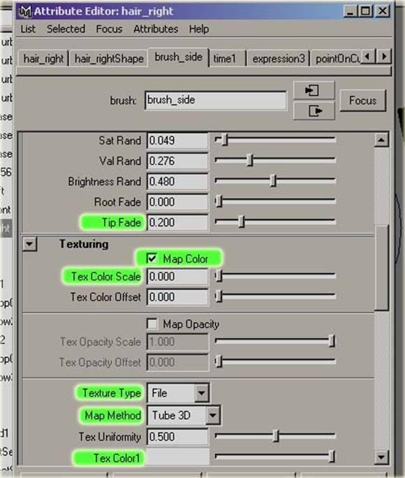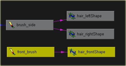 現在你必須將筆刷執行到其它還沒有頭發的線上 1. 選擇 hair_split_curve02 執行 painteffects->curve utilities->attach brush to strokes2. 選擇新的 stroke 并 shift 選擇其它同一邊的曲線 執行 painteffects->curve utilities-> set stroke control curves3. 選擇新的 stroke 并選 hair_side_stroke01 執行 painteffects->share one brush( 讓你只要調整 hair_side_stroke01 的屬性就會影響新的那條 stroke)4. 選擇留海的曲線執行 attach brush to strokes 及 set stroke control curves5. 命名其為 hair_front_stroke6. 選擇 hair_side_stroke01 執行 painteffects->get setting from selected stroke7. 選擇 hair_front_stroke 執行 painteffects-> apply setting to selected strokes