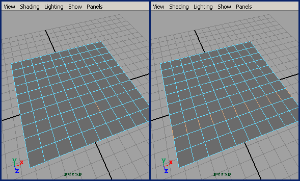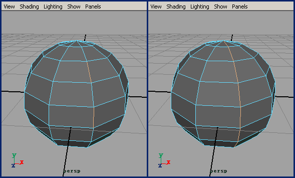 先講一下選擇邊線的方法。選擇一段或幾段邊線,按 選連續邊 按鈕,可以選擇一段或幾段連續的邊線。這個功能和 maya 的 polygons->selection->select contiguous edges 是完全相同的。最大 2d/3d 角度一般不要調整,用默認值就行了。不過調整最大 2d/3d 角度將會影響到選系列邊和切割的成功率,也有可能增大成功率。
