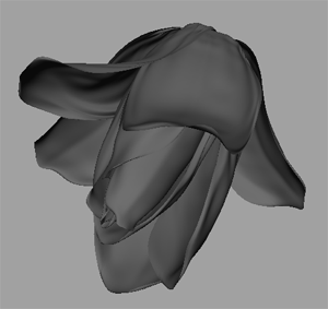 首先我們看到花瓣的紋理是從根到邊呈放射狀的,為了后面的材質及動畫制作,模型的布線是很重要的,我們用 nurbs 建摸來完成,考慮花瓣的紋理是由內向外的走向,模型的 uv 最好順著紋理的方向做。