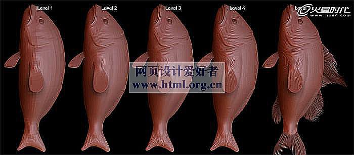 我決定在Maya中把魚(yú)做的盡可能的詳盡。在一級(jí)細(xì)分的模式下,我開(kāi)始用Standard brush和Inflate brush來(lái)雕刻出最基本的結(jié)構(gòu)。我繼續(xù)深入下去,尤其是在二級(jí)和三級(jí)細(xì)分下對(duì)鰭、鰓蓋、臀鰭、背鰭軟和尾鰭。(圖13)